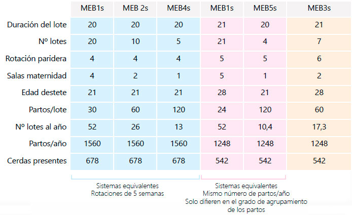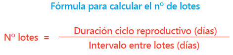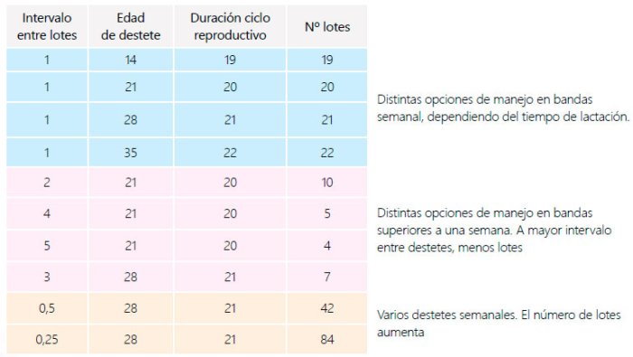 Dependiendo del tiempo transcurrido entre eventos iguales, la granja se organizará de forma semanal (cada semana hay partos, destetes y cubriciones) o en bandas de más de 1 semana (2,3,4,5). El número de lotes, por tanto, dependerá de la organización de la granja, junto a la duración del ciclo reproductivo: