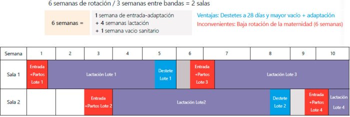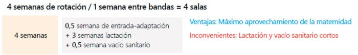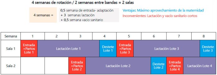 En este sistema, podría destetarse a 28 días, si bien la norma de nº lotes x intervalo entre lotes = duración del ciclo no se cumpliría. En este caso en el que 4 lotes * 5 semanas = 20 días, al destetar a 28 días el ciclo se alargará hasta 21 días. Esto alterará el orden de tareas una vez por ciclo, por lo que en cada ciclo tendremos una semana “sin tareas” para reajustar la duración del ciclo.