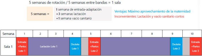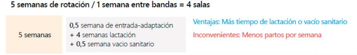 En este caso, para granjas de manejo en 5 semanas, los partos serán cada 5 semanas y, por tanto, la rotación será obligatoriamente cada 5 semanas. Así, los 24 partos semanales que teníamos en un manejo en lotes semanales rotando las salas cada 5 semanas, se agrupan ahora en 120 cada 5 semanas: