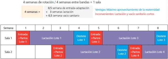 El otro punto importante para entender el manejo en bandas es comprender cómo se ocupan las salas de maternidad, o lo que es lo mismo, su rotación (tiempo en semanas que pasa entre la entrada de un lote en una sala de maternidad y la entrada del siguiente lote de cerdas en la misma sala). Esto facilita también comprender cuántas salas son necesarias en cada uno de los diferentes sistemas de manejo.