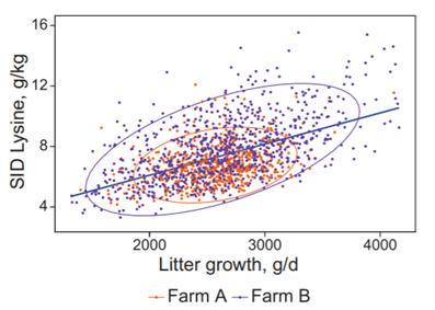 A figura (Gauthier et al., 2019) demonstra a variabilidade dos requisitos de SID Lis de porcas em lactação individuais em função da taxa de crescimento da ninhada.