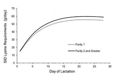 A Figura 8-8 (Swine NRC, 2012) demonstra que os requisitos de SID Lis são geralmente mais elevados na segunda e terceira semanas de lactação.
