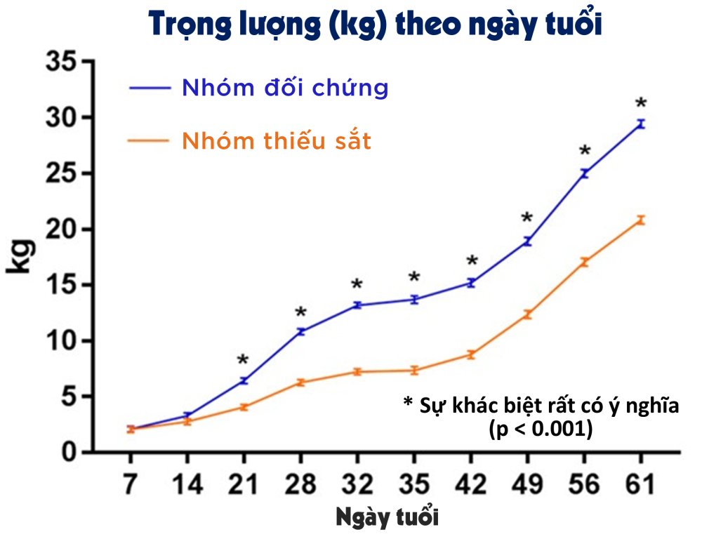 Theo nghiên cứu tổng hợp của Svoboda (2017), heo con có nhu cầu sắt 7-16mg/ngày để bảo đảm cân bằng hàm lượng hemoglobin trong máu và sắt dự trữ, hơn nữa còn cần 40mg sắt/ngày cho mỗi kg tăng trọng. Hơn nữa, heo con có tốc độ tăng trưởng đặc biệt, tăng gấp đôi trọng lượng sau khi đẻ 7 ngày và tăng gấp 4 lần sau 21 ngày (Szudzik, 2018). Heo con tăng từ 1.5kg lên 3kg trong vòng 7 ngày đầu tiên sau khi sinh và hàm lượng huyết tương tăng 30% (Jain, 1986). Nghiên cứu của Perri (2016) cho thấy, heo con có trọng lượng cai sữa lớn hơn có hàm lượng hồng cầu và lượng sắt trong máu thấp hơn so với heo nhẹ cân. Heo con bị bệnh còi cọc sau cai sữa PMWS (Segales, 2004) hoặc bị nhiễm Mycoplasma suis (Groebel, 2006) sẽ dẫn đến kết quả bị thiếu máu, bấm đuôi/tai hoặc thiến cũng làm heo con mất máu (Heinritzi và Plonait, 1997).
