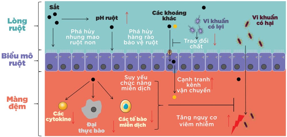 Tác động của thiếu sắt đối với đường ruột được trình bày qua hình 2 (Ding, 2020): phá hủy nhung mao ruột, giảm tiết axit dịch vị, phá hủy hàng rào bảo vệ ruột (các liên kết chéo), tăng nguy cơ nhiễm trùng ruột và cản trở kênh vận chuyển ion. Hơn nữa, thiếu sắt làm giảm khả năng miễn dịch không đặc hiệu, giảm các chất chuyển hóa được tổng hợp bởi vi khuẩn có lợi và tăng nguy cơ viêm ruột. Do vậy, đảm bảo cung cấp Fe hiệu quả cho heo con theo mẹ và kiểm soát stress khi cai sữa là yêu cầu quan trọng để đạt mục tiêu tăng trưởng tốt.
