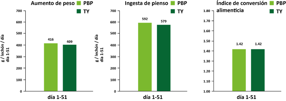 TechnoYeast ha demostrado en numerosos ensayos que puede sustituir, parcial o totalmente, el plasma. Y esto puede lograrse sin efectos negativos sobre el rendimiento, ni sobre la salud, y además con costes reducidos u optimizados. Por ejemplo, en una prueba, se sustituyó completamente el plasma (PBP) de los piensos prestarter y starter por TechnoYeast (TY). Al cabo de siete semanas, los lechones alimentados con TechnoYeast presentaban una ganancia de peso, una ingesta de pienso y un índice de conversión similares a los alimentados con plasma (figura 1).