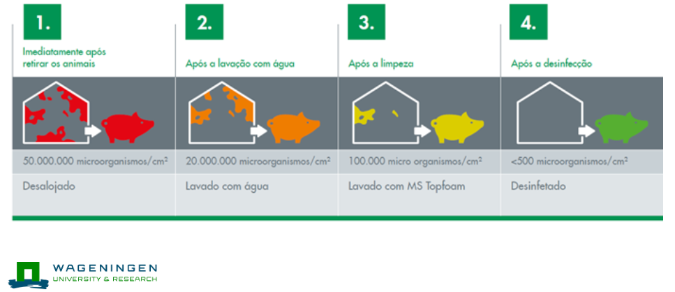 Observando el diagrama anterior, es posible comprender lo que sucede desde el momento en que se retira el lote de animales hasta el final de la desinfección. El nivel de contaminación en el galpón inmediatamente después de desalojar a los animales ronda los 50 millones de microorganismos por cm². Con un enjuague inicial utilizando sólo agua, logramos reducir esta contaminación a 20 millones/cm². Sin embargo, sólo después de aplicar un detergente este nivel baja a 100 000 microorganismos por cm². Esto muestra que el 98% de la contaminación inicial de la casa se elimina durante la limpieza con detergente.