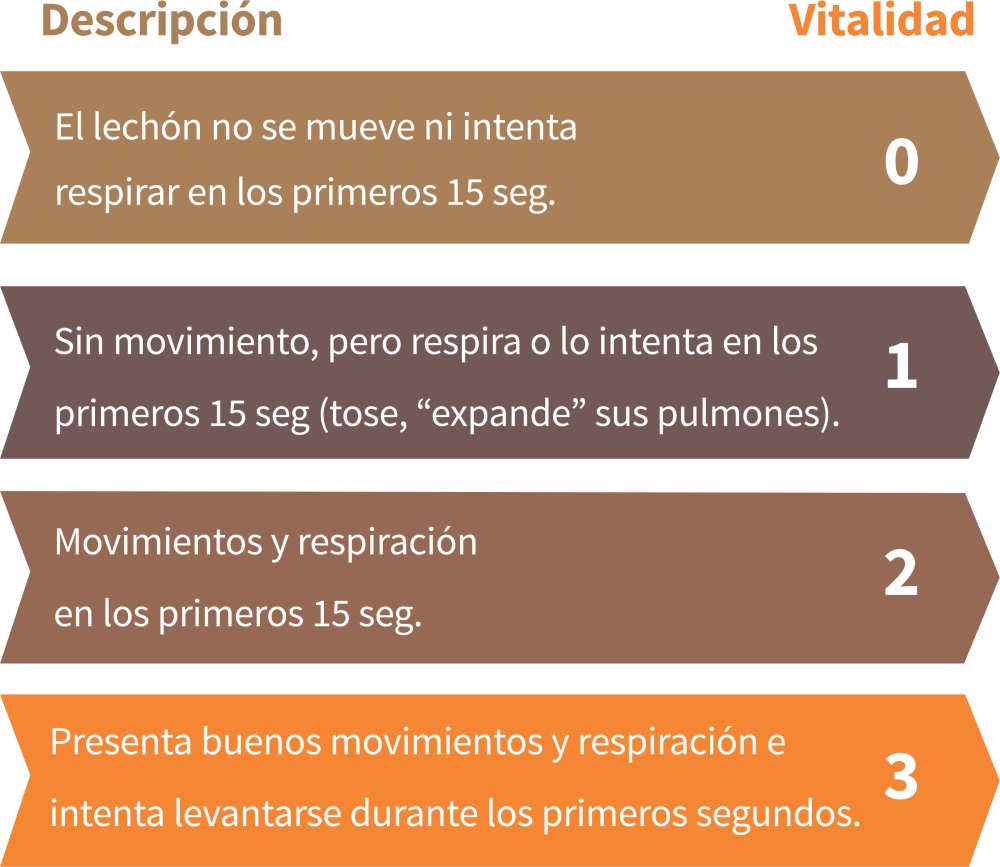 - Vitalidad: índice de Baxter adaptado, puntuando los lechones a medida que se observan por primera vez y no el los primeros 15 segundos