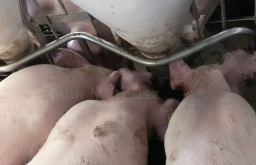 Este tipo de mordedura puede ocurrir cuando el espacio en el comedero es limitado o cuando el suministro de pienso no es suficiente. Hipotéticamente, esta agresión relacionada con el comedero puede persistir en la fase inicial de engorde si problemas similares ya estaban presentes durante el periodo de transición. No es raro que los lechones importados a granjas de engorde en Polonia lleguen con lesiones auriculares, ya sean recientes o cicatrizadas; estas lesiones suelen resolverse en aproximadamente tres semanas. Sin embargo, en algunos corrales individuales, el problema puede persistir por un periodo más largo.