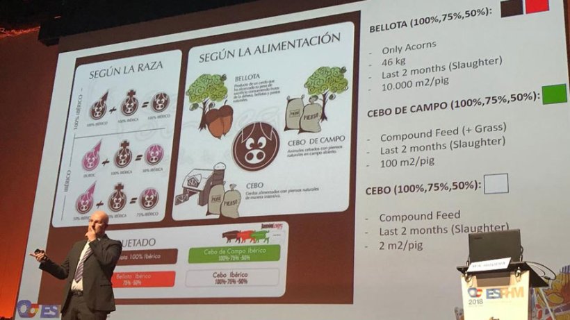 - Sistemas de producción: blancos e ibéricos y cuatro tipos de producción – cárnicos de 100-105 kg para fresco y procesado, cerdos pesados de 115-125 kg para productos curados y jamones, producción de cochinillo de 7-8 kilos (cochinillo) e ibérico con su norma específica que incluye tres categorías bellota (762.354 cerdos), cebo campo (232.957 cerdos) y cebo (2.108.783 cerdos), todos ellos en base genética ibérico del 100% - 75 % y 50 % (377.498 cerdas y 3.300.000 cerdos anuales).