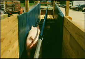 Los pasillos dobles favorecen el desplazamiento al ser dos los animales que encabezan el grupo. Fuente fotos:Dr. Temple Grandin's Web Page. http://www.grandin.com/behaviour/unload.truck.html |