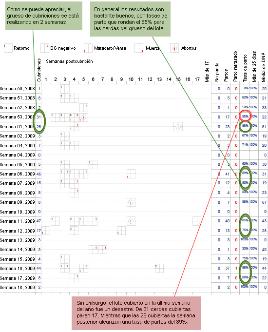 - En enero tenemos una tasa de partos del 113% porque se han cubierto 37 cerdas y han parido 42. En este tipo de análisis mes a mes, los programas productivos contemplan la información desde un punto de vista temporal, para poder obtener resultados de forma inmediata. El problema está en que las 37 cubriciones de enero no tienen nada que ver con los 42 partos. Estos partos corresponderían a las cubriciones de noviembre del 2008. Por el mismo motivo descienden en exceso las tasas de partos de febrero y marzo.