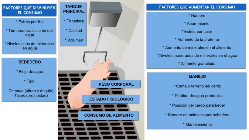 Las necesidades hídricas del lechón son difíciles de cuantificar, no sólo por la propia dificultad de la investigación en sí, sino por la cantidad de factores que afectan el consumo agua. A continuación mencionaremos los más importantes en la figura 1.