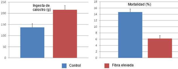 Por otro lado, estas dietas durante el periparto altas en fibra aumentan la ingesta de calostro en los lechones más pequeños (Figura 5) y aumentan su supervivencia (Figura 6).
