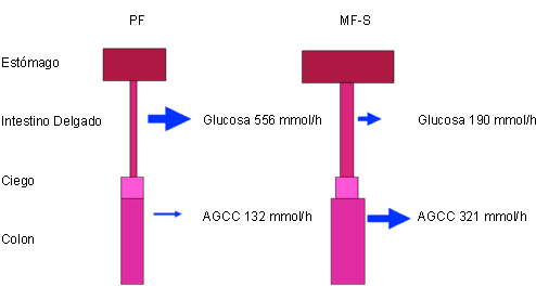 Figura 1. Efecto de una alimentación con poca fibra (PF) o con mucha fibra soluble (MF-S) sobre el llenado del intestino y la absorción de glucosa y AGCC. La concentración de almidón era de 517 y 216 g/kg de MS de las dietas PF y MF-S, respectivamente, y la de FD de 177 y 428 g/kg MS de las dietas PF y MF-S, respectivamente. Datos de Serena et al. (2008, 2009).