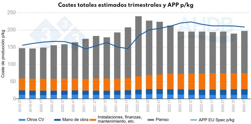 Figura 3. Costes totales estimados trimestrales y precio como APP p/kg (All pig prices p/kg)