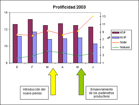 Durante la primavera de 2003, tres meses después de la introducción de los dos nuevos tipos de piensos, aparecieron algunos problemas en gestación y sobretodo en las salas de parto.