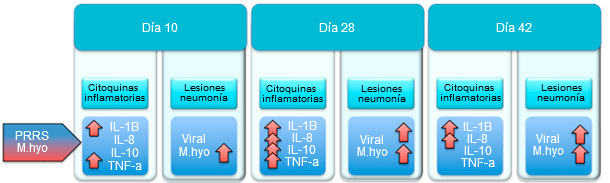 Tanto PRRSv como M.hyo tienen un gran efecto sobre la producción de citoquinas inflamatorias, que pueden favorecer la inducción de enfermedad y la persistencia de los organismos en el hospedador.