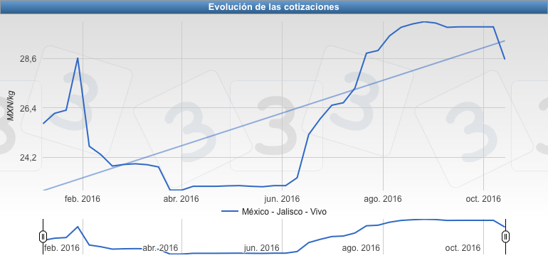 Gráfico 1. Evolución del precio del cerdo semanal en Jalisco en 2016.