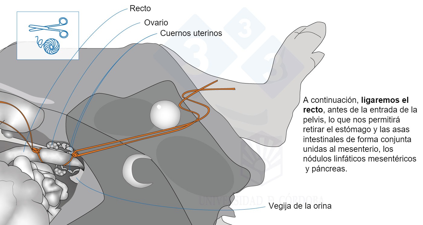 Extraeremos el bazo y ligaremos y cortaremos el recto antes de la entrada de la pelvis (en el capítulo anterior ya ligamos el esófago). Esto nos permitirá extraer el estómago, asas intestinales y páncreas sin pérdida de contenido intestinal. Una vez extraído, observaremos los nódulos linfáticos mesentéricos.