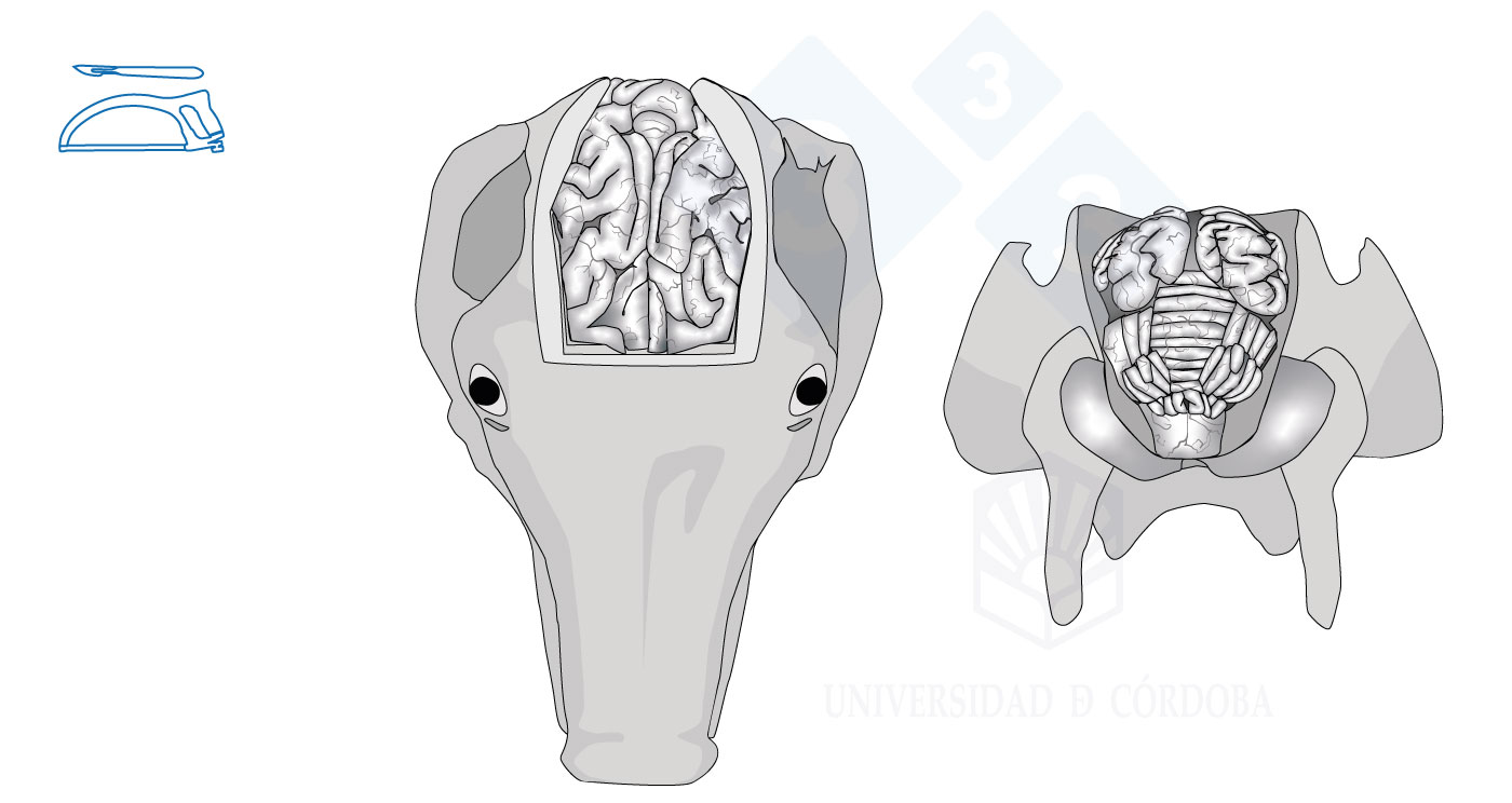 Por último, cortaremos el cráneo para acceder al cerebro y al cerebelo, que extraeremos cortando el bulbo olfatorio, el quiasma óptico, la hipófisis y los pares craneales.