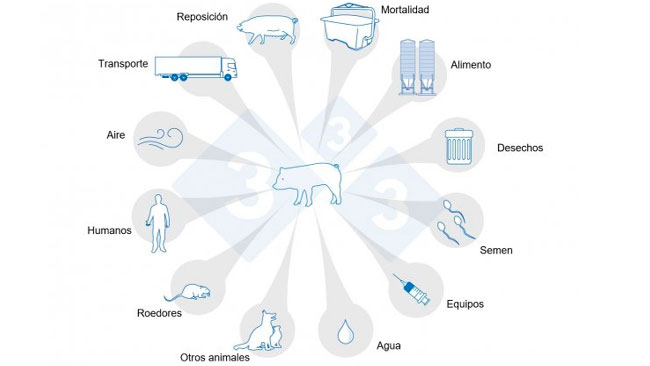 3. No hemos entendido la importancia de establecer, respetar y auditar continuamente un programa de bioseguridad efectivo y no psicológico. El virus PRRS tiene por lo menos 12 rutas de transmisión que, dependiendo de la complejidad y localización del sistema, son más o menos importantes (figura 1) Como se ilustra en la siguiente ecuación, y es bien sabido por todos nosotros, la bioseguridad es compleja. Lamentablemente, en muchos sistemas de producción porcina el costo de su implementación y mantenimiento todavía se considera un gasto y no una inversión. No tener un programa efectivo de bioseguridad permite la recontaminación continua, tanto externa como interna, de las poblaciones susceptibles en el plantel.
