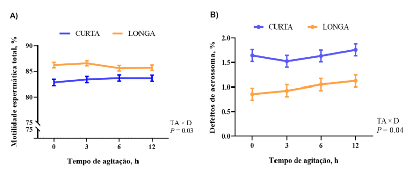 Figura 1 - Efeito da interação entre o tempo de agitação (TA; 0, 3, 6 e 12 horas) e diluente (D) (longa duração, LONGA e curta duração CURTA) na motilidade espermática total (A) e defeitos de acrossoma (B) em doses de sêmen de suínos (n=20 machos). Valores são expressos pela média ± EP (erro padrão).