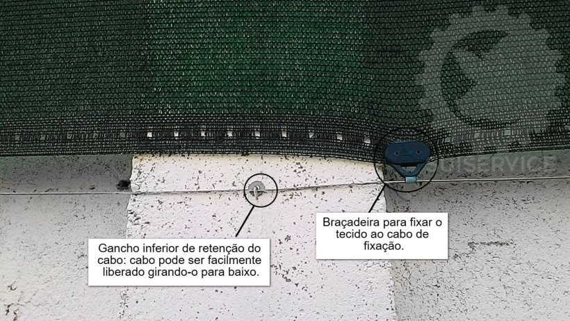Dois cabos de aço trançados paralelos são fixados acima e abaixo das janelas ao longo de todo o comprimento do galpão, equipados nas extremidades com um esticador para manter o tecido esticado.