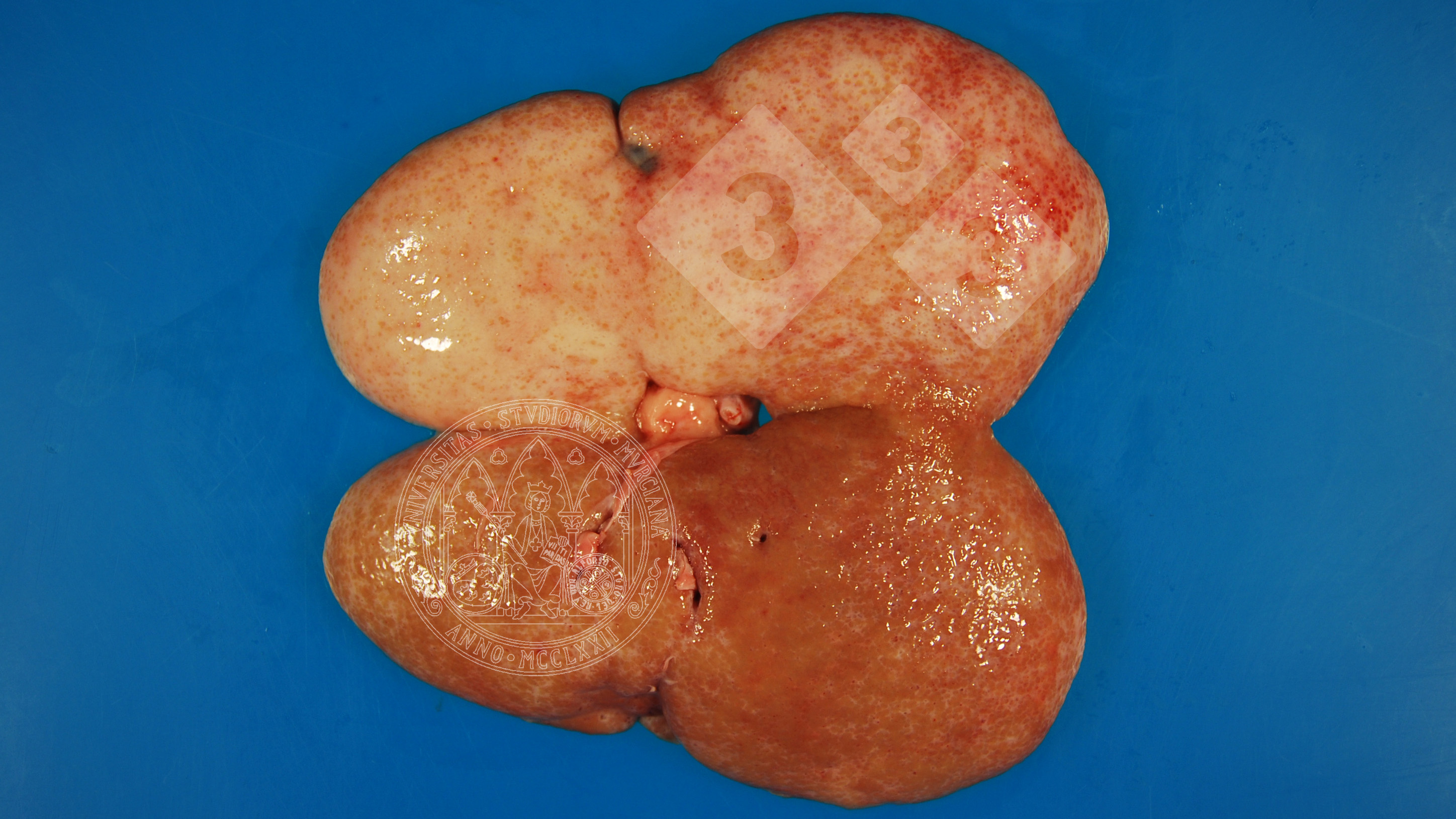 Rim aberto de suíno adulto que aparece esbranquiçado em grande parte na superfície e contornos irregulares. É um processo crônico de fibrose (esclerose) como evolução da nefrite intersticial e está clinicamente associado à insuficiência renal crônica. Devemos diferenciar essa lesão de outros processos inflamatórios crônicos ou degenerativos.