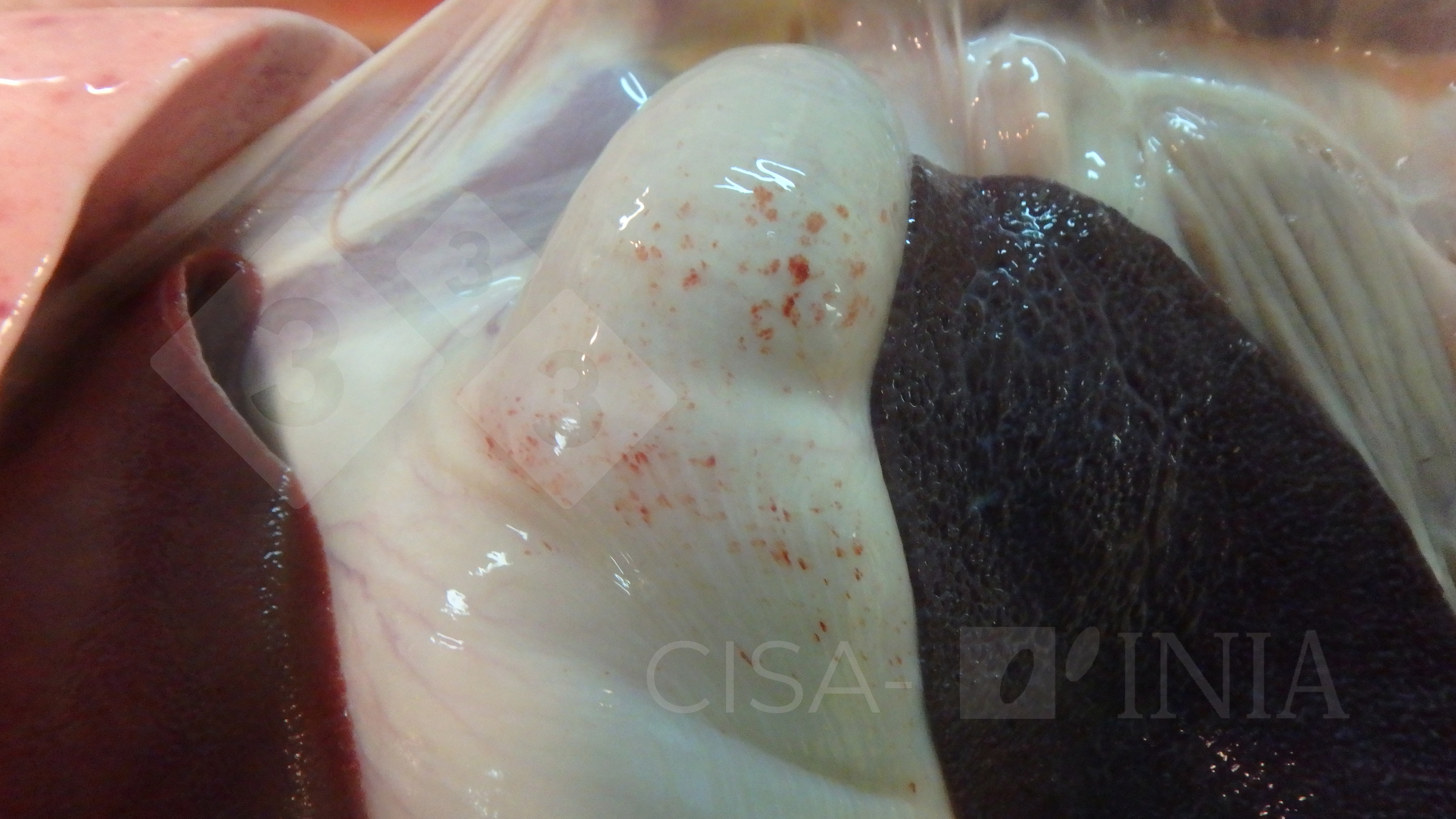 Quadro clínico de PPA subaguda 23 dias depois da infecção experimental. Observam-se petequias no fundo do estômago. O diagnóstico diferencial deve incluir PPC, diversas septicemias (erisipelas, salmonelosis, Actinobacillus suis), PRRS altamente virulento, diáteses hemorrágica, trombocitopênica e envenenamento por anticoagulante.