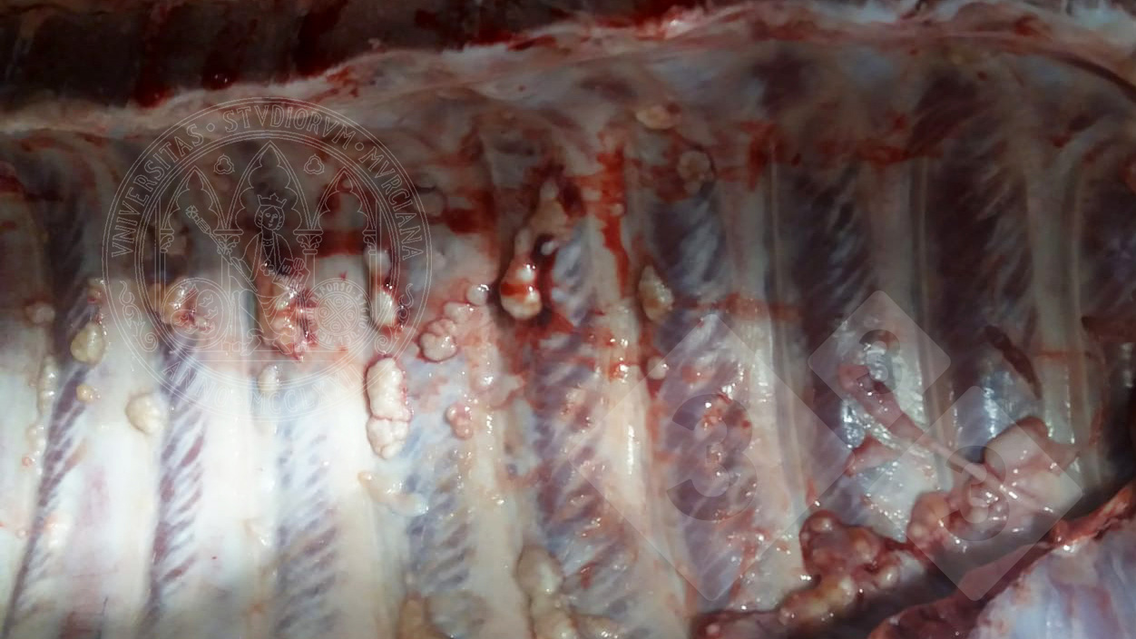 Observam-se lesões de cor branco-amarelado de diferentes tamanhos aderidas a parte interna das costelas de um suíno em crescimento. Tratam-se de granulomas tuberculosos numa superfície serosa. Os suínos são susceptíveis a infecção por Mycobacterium bovis, M. tuberculosis e pelo complexo M. avium e as lesões podem chegar a estas localizações por disseminação hematogênica ou linfogênica retrógrada.