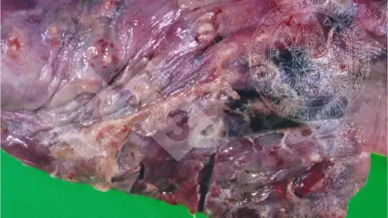 Houve aumento de leitões desmamados em mau estado, com respiração abdominal dificultosa e baixa resposta ao tratamento antimicrobiano. A mortalidade variou entre 6% e 15%. Qual é a causa mais provável dessa lesão?