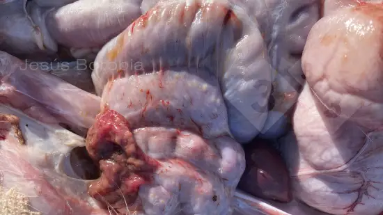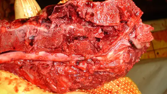 Ao cortar a carcaça ao meio, encontra-se um abscesso na coluna vertebral, que se rompe. Qual pode ser a origem?