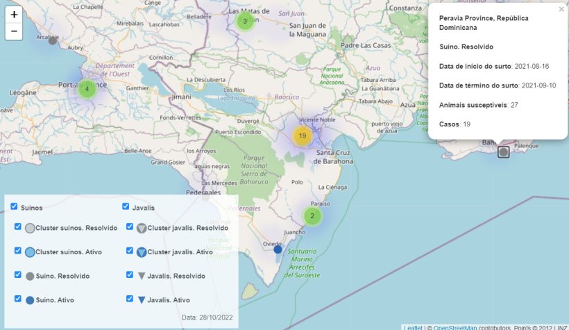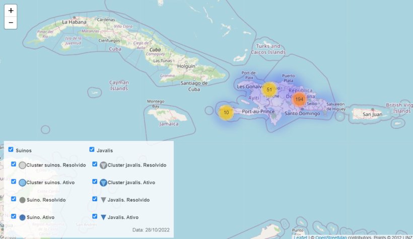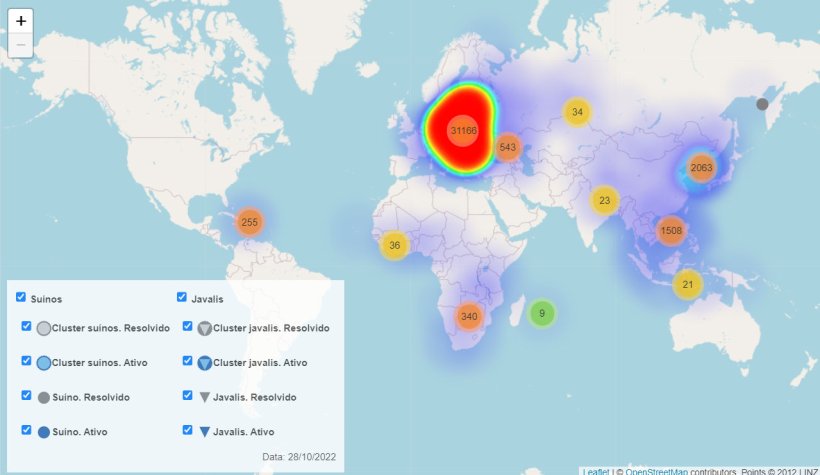 A partir da legenda do mapa pode mostrar ou ocultar os casos de javalis e suínos, escolhendo entre casos isolados ou aglomerados e entre surtos ativos ou resolvidos. Isso ajudará você a encontrar os focos no mapa, sendo capaz de ocultar os focos que você não está procurando.