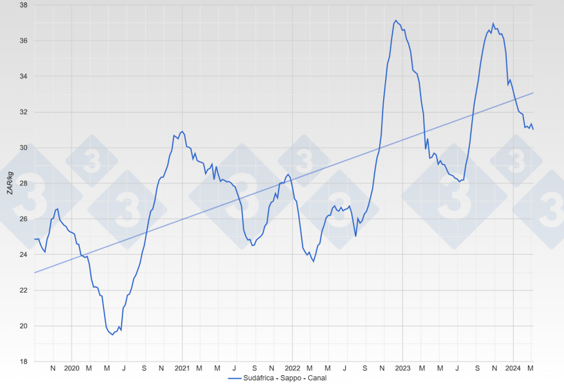 Para a África do Sul, publicaremos o preço médio ao produtor para a categoria de suínos de terminação (pesando 80-109,99 kg) fornecido pela Organização Sul-Africana de Produtores de Suíno (SAPPO). O preço ao produtor refere-se ao preço de compra do frigorífico pago ao produtor, por kg, pelas carcaças de suínos e exclui o imposto sobre o valor acrescentado (IVA), transporte e comissões.