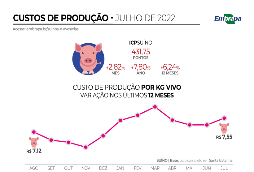 Assim, o custo total de produção por quilo de suíno vivo produzido em sistema tipo ciclo completo em Santa Catarina passou de R$ 7,34 em junho para R$ 7,55 em julho. Nos primeiros seis meses do ano, o ICPSuíno acumula 7,80% de alta e, nos últimos 12 meses, 6,24%.