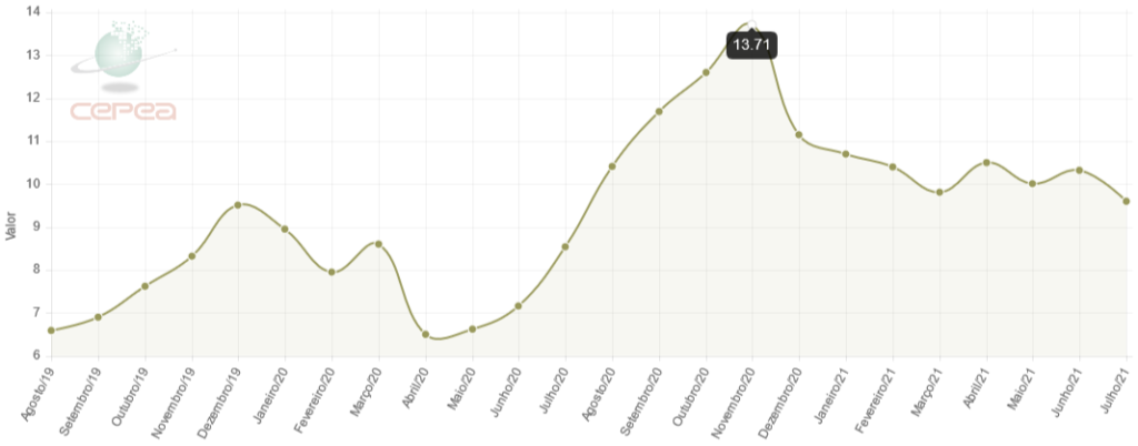 Gráfico 1. Preço kg carcaça suína especial em São Paulo nos últimos 2 anos. Fonte: CEPEA