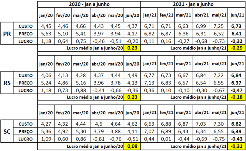 A tabela 2, com dados da EMBRAPA e CEPEA, compara custos e preços praticados e projeta o lucro/prejuízo nos três estados do Sul no primeiro semestre de 2021, comparando com 2020, mostra um quadro negativo no acumulado deste ano. Observa-se que o pico de custo foi atingido em maio/21, ultrapassando os R$ 7,00 por kg vivo produzido nos três estados.