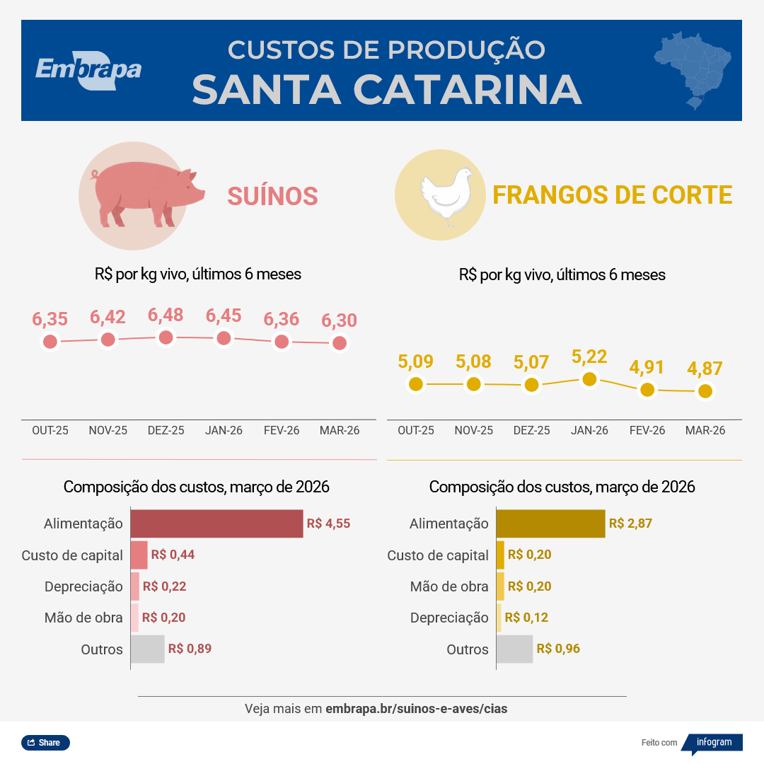 Em Santa Catarina, o custo de produção do quilo do suíno vivo passou de R$ 6,36 em fevereiro para R$ 6,30 em março, queda de 0,96%, com o ICPSuíno recuando para 360,63 pontos. No ano, o índice acumula uma diminuição de 2,71%. Na soma dos últimos 12 meses, a variação é de -1,76%. A ração, responsável por 72,22% do custo total de produção em março, baixou 0,55% no mês de março e acumula -1,96% no ano.