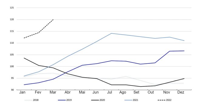 O número é 16,3% menor que o registrado no mesmo mês de 2021 (mês com o segundo melhor desempenho da história), com 109,2 mil toneladas.