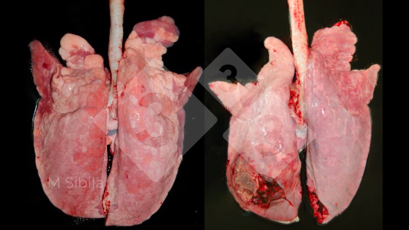 Bei einer akuten M. hyopneumoniae-Erkrankung (und ohne Sekundärinfektionen) ist die Läsion deutlich abgegrenzt und lässt sich leicht erkennen und beurteilen. In den meisten Fällen wird die Läsion jedoch durch das Vorhandensein anderer bakterieller oder viraler Erreger verschlimmert und variiert in Farbe, Konsistenz und Ausdehnung (jedoch nicht in ihrer kranioventralen Lage).