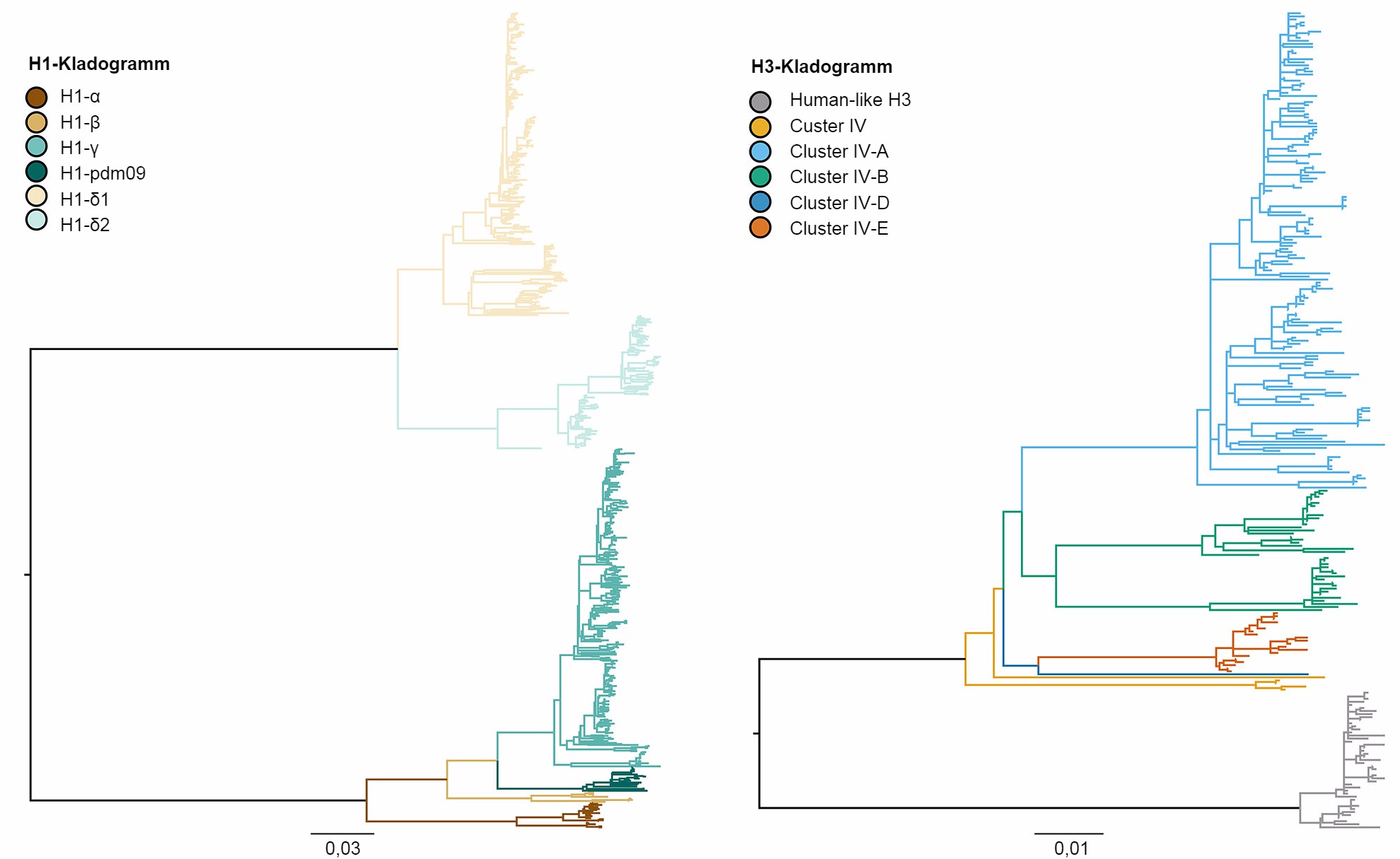 Abbildung 1: Kladogramm, das die genetischen Beziehungen zwischen den Gensequenzen des Hämagglutinins des H1- und des H3-Influenza-A-Virus beim Schwein von 2015 mithilfe der Maximum-Likelihood-Methode beschreibt. Die farbigen Äste kennzeichnen die verschiedenen Kladen. Alle Astlängen sind maßstabsgetreu gezeichnet und der Maßstabsbalken zeigt die Anzahl der ausgetauschten Nukleotide pro Position.
