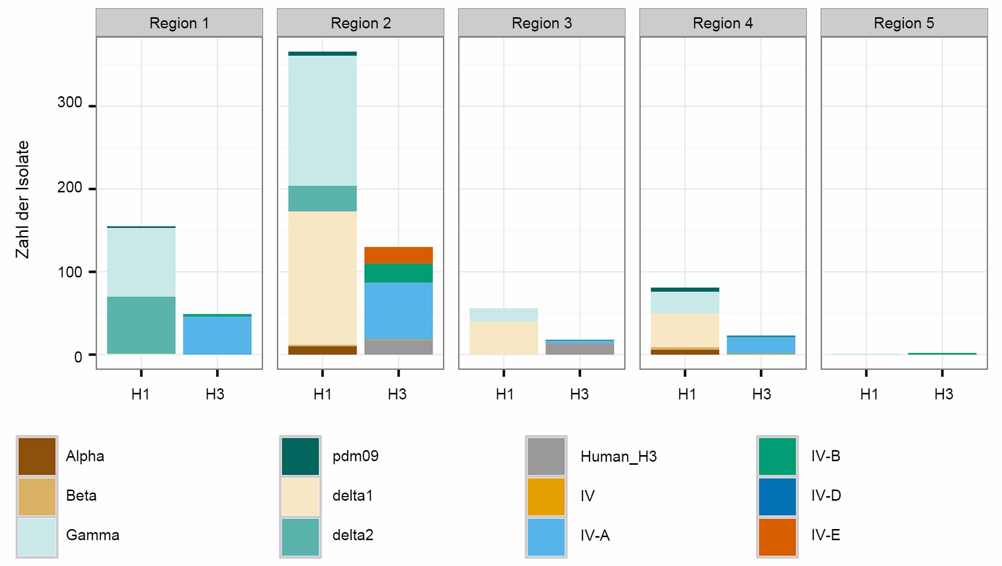 Ein zweites Problem bezieht sich auf die räumlichen Muster bei der Diversität des IAV beim Schwein. Auf Grundlage der Veterinärbezirke der Abteilung Tier- und Pflanzenschutzkontrolle des Landwirtschaftsministeriums der Vereinigten Staaten sind die USA in fünf verschiedene Regionen eingeteilt, aus denen über Krankheitsfälle berichtet wird (Abb. 2A). Zwischen den Regionen gibt es feine und wichtige Unterschiede hinsichtlich der Diversität und des Inhalts der Proben, die dem Überwachungssystem des Landwirtschaftsministeriums der Vereinigten Staaten zur Verfügung gestellt werden (Abb. 2B). Während in den Regionen 1 und 2 mehr H1N1 festgestellt wurde, weist Region 3 mehr H1N2 und Region 4 mehr H3N2 auf. Trotz eines Schweinebestands von 1,6 Mio. Schweinen (National Agricultural Statistics Service (NASS) - Landwirtschaftsministerium der Vereinigten Staaten 2012) gibt es sehr wenige Daten aus der Region 5. Die Region 2 weist die größte Diversität hinsichtlich der verschiedenen festgestellten HA- and NA-Kladen auf und die meisten IAV-Isolate vom Schwein stammen aus dieser Region. Insgesamt deutet die Verteilung der HA- and NA-Klade darauf hin, dass möglicherweise regionale oder lokale Entscheidungen bezüglich der Impfstoffkomponenten von Bedeutung sind.