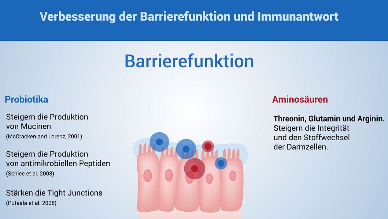 Probiotika und Aminosäuren zur Verbesserung der Darmbarriere. Omega-3-Fettsäuren, Plasma, Präbiotika etc. zur Verbesserung der Immunantwort.