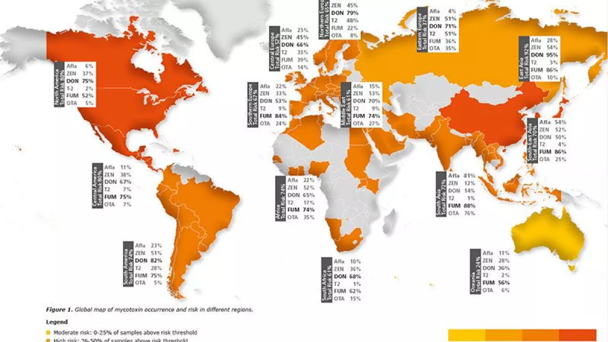 Mappa globale della ricorrenza e del rischio di micotossine in diverse regioni. I quadrati indicano quanti% dei campioni analizzati della regione sono stati contaminati con le rispettive micotossine. I colori indicano diversi livelli di rischio in base alla legenda riportata di seguito. https://www.biomin.net/en/blog-posts/2017-biomin-mycotoxin-survey-results/