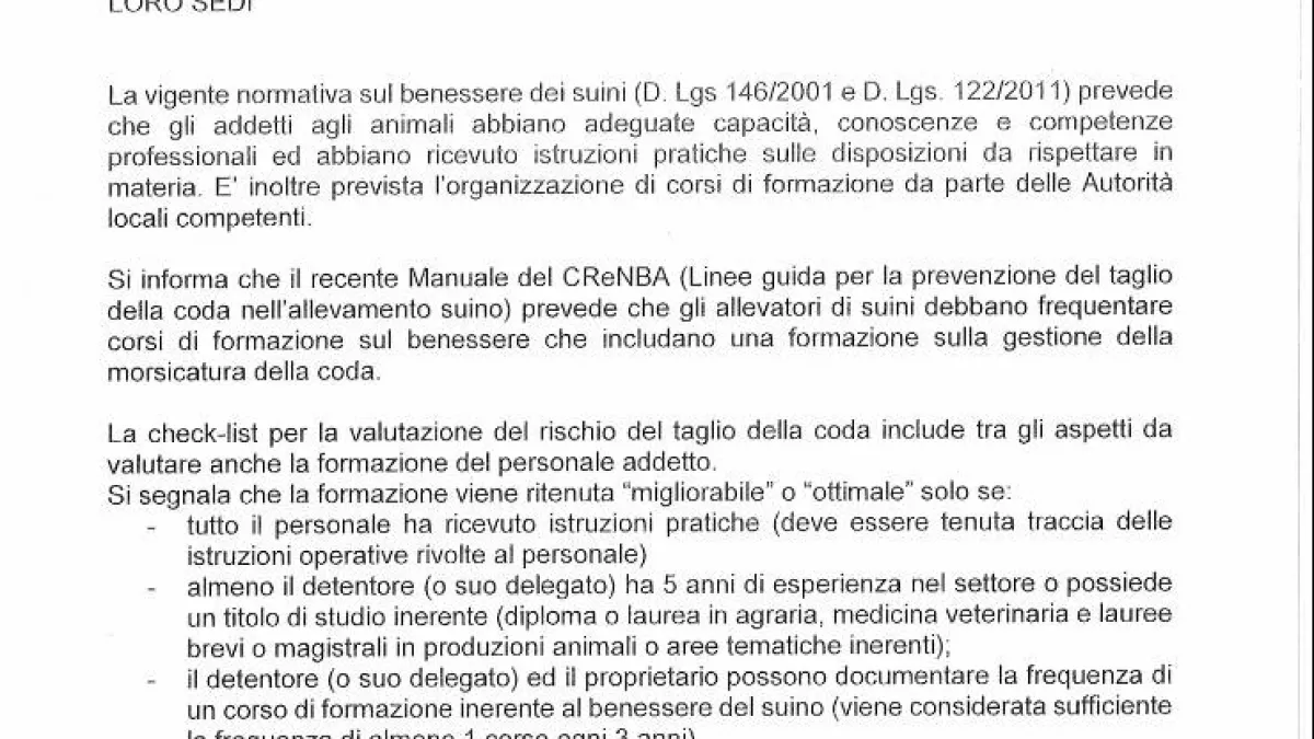 prot. 2173 DEL 15/11/2018 "CORSI DI FORMAZIONE SUL BENESSERE ANIMALE - PREVENZIONE TAGLIO CODE SUINI"