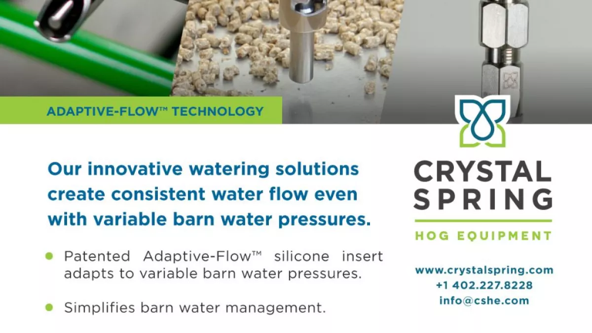 Crystal Spring Adaptive-Flow watering solutions simplify barn water management⁠, reduce water and feed wastage,⁠ and ensure that each pig gets the correct daily water intake⁠.