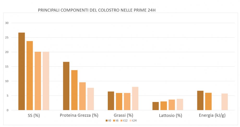 La Figura 1 mostra come la composizione del colostro cambi radicalmente nelle prime 24h di produzione, riducendo la presenza di solidi totali, proteine ed energia, in favore di grassi e lattosio e transitando gradualmente verso la normale composizione del latte. Alla nascita del primo suinetto, il colostro contiene circa 64mg/ml di IgG, ma entro 24h arriva a circa 10mg/ml, e scende ulteriormente col passare del tempo.