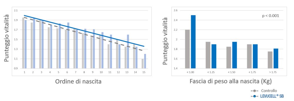 La vitalità dei suinetti alla nascita ha un impatto sul tempo che impiegheranno a raggiungere la mammella e mangiare. Questo parametro può essere misurato osservando i suinetti nei primi 15 secondi dopo la nascita. Attribuire un punteggio che va da 0 per i suinetti che non si muovono e non provano a respirare fino a 3 per quelli che si muovono, respirano e provano già ad alzarsi. La Figura 2 mostra l’effetto del lievito vivo Levucell SB sul punteggio di vitalità dei suinetti, dopo essere stato integrato nel mangime delle madri per 3 settimane prima del parto.