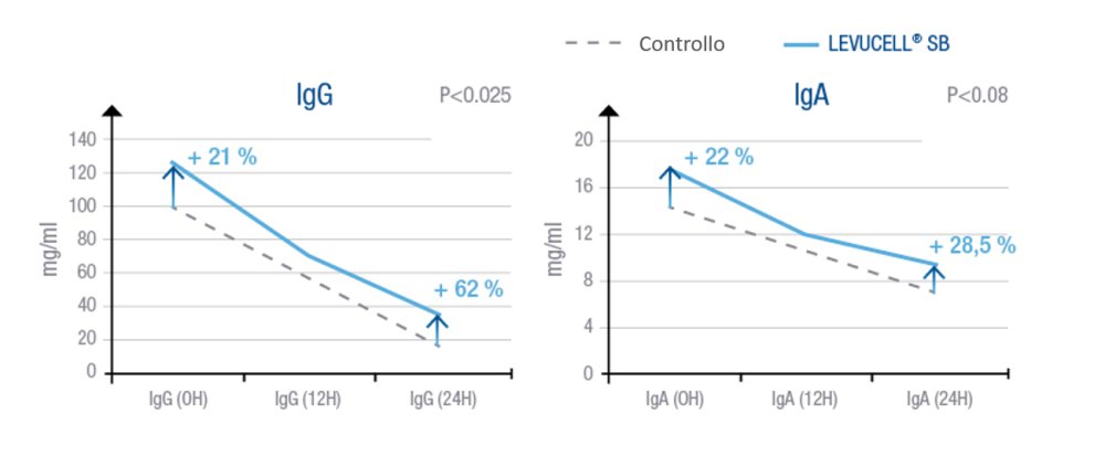 La Figura 3 invece mostra i risultati di una prova effettuata nel 2012, dove campioni di colostro sono stati prelevati al parto e a +3h, +6h, +12h e +24h. Per ogni campione, è stato misurato il livello di immunoglobuline (IgG, IgA). Le scrofe che ricevono un’integrazione di Levucell SB nelle tre settimane pre-parto, producono un colostro più ricco di immunoglobuline che si mantiene tale più a lungo, e supera significativamente i livelli del gruppo di controllo.