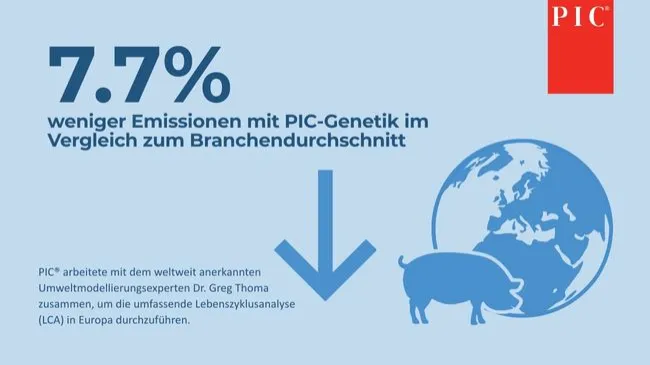 Eine neue europäische Lebenszyklusanalyse (LCA) bestätigt, dass ein vollständiges PIC-Zuchtprogramm (Eber + Sau) zu 7,7 % weniger Treibhausgasemissionen (THG) im Vergleich zum Branchendurchschnitt führt.